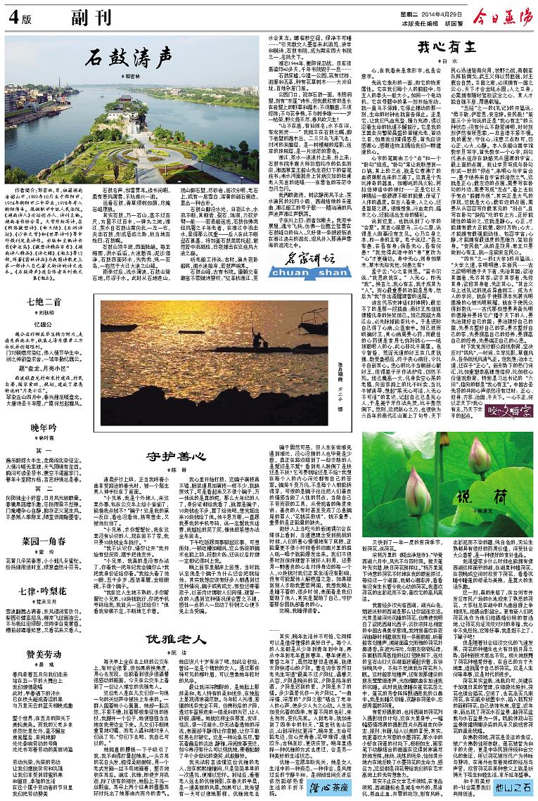 石鼓涛声【郭密林简介】祖籍湖南省韶山市,1959年10月生于邵阳市,1976年衡阳市二中毕业,下放衡南县云市公社渡口大队,1978年考入衡阳师专,1981年—1995年,先后在车江铜矿、湘运衡阳公司子校和汽车西站从事中学教师、乘务员和门卫工作,现供职市中级法院。《湖南诗人》论坛创办人、诗刊主编。湖南省作协会员。大学开始写诗,在《湖南诗人》、《网络微型诗》、《新大陆》、《亚洲诗坛》、《沙华文学》和《世界诗叶》等中外民间报刊发表诗作,出版和主编诗书有《命运鸟、《微型诗精品百首》、《湖南诗人精品》、《诗之眼》等十二部,所著《密林诗品》为我国诗歌史上第一部诗人自己著文析诗的诗文选本。《石鼓涛声》选自作者散文系列《湘土》。 石鼓名声,如雷贯耳。读书闲暇,虽有寒风薄雾,不妨乘兴一游。 远看石鼓,青草绿树如荫,尽掩石峰原貌。 其实石鼓,乃一石山,高不过百尺,方圆不过百米,一弹丸之地;湘江、蒸水自石鼓山南向北,一左一右,夹击石鼓,形成唇齿之势,故当地百姓曰:石鼓嘴。 石鼓山顶平坦,四面陡峭。每至梅雨,洪水滔滔,大浪激流,泥沙俱净,石鼓四面环水,光秃秃,纯一石岛,一岿然于大江大浪之山峰。 雨季过后,浅水薄浪,石鼓山背石地,尽浮于水。此时从石地进山,观山脚石壁,尽砂岩,层次分明,老石上,或有一层雪白、浑黄的硝石痕迹,显出一种古朴。 石鼓山脚没水处,日夜江水,水流不断,其断岩、裂石、蚀洞,刀砍斧劈一般……若退船远观,石鼓仿佛饱经风霜之千年老者,在湘江中流击水,显得那么沉重——后人在此不断垒石奠基,将如盖石鼓层层托起,傲然是中流砥柱,日夜搏击在这疾风大浪之巅。 听老船工传说:古时,渔夫夜卧船底,闻水浪拍岸,若鼓声响耳。 石鼓山峰,古有书院。唐朝文豪韩愈不禁赋诗赞叹:“红亭枕湘江,蒸水会其左;瞰临渺空阔,绿净不可唾……”引无数文人墨客来此游览、讲学和赋诗,石鼓书院,成为南宋四大书院之一,名扬天下。 难忘1944年, 衡阳保卫战,日军狂轰滥炸40多天,千年书院毁于一旦…… 石鼓废墟,今建一公园,筑有过桥、游廊和瓦亭,种有花草树木……大片旧址,百姓杂居门前。 公园门口,现存石鼓一面,朱陵洞壁,刻有“东崖”诗书,但我最欣赏的是长在岩壁上的野草和灌木:不须雕凿,不须修饰;不与花争艳,不与树争雄──一岁一枯荣,野火烧不尽,春风吹又生! “山不在高,有仙则名;水不在深,有龙则灵……”我挺立在石鼓之嘴,脚下岩壁的灌木丛,二三只鸟飞来飞去,对河的来雁塔,是一树模糊的塔影,远岸的珠晖塔,是一片迷茫的雾色。 湘江、蒸水一浪浪扑上来、扑上来:石鼓书院朱熹大师羽扇纶巾的侃侃而谈湘西草堂王船山先生夜灯下的奋笔疾书耒水河面孤舟上贫病交加的杜甫老人无言的绝唱……在雾色的苍茫中忽闪忽闪。 我两眼微闭,树欲静而风不止:蒸水渔民的拉网小调西湖姑娘的采莲曲湘江船工的号子歌……随汹涌的风声浪声湘江声飘荡。 子在川上曰:逝者如斯夫。我双手展翅,魂兮飞扬,仿佛一位腾云驾雾在石鼓峰口的仙人,又好像一条披波斩浪在湘江浪尖的游龙,迎风扑入那涛声雾海的混沌之中。 我心有主 白水 心,在我看来是象形字,也是会意字。 先说它象形的一面,即它的物质属性。它在我们每个人的胸腔中,与主人的拳头一般大小。如同一个电动机,它在母腹中的某一刻开始发动,就一直一刻不停,它停止搏动的那一刻,生命的时钟也就宣告停止。正是它,让我们气血充盈、精力充沛,得以沿着生命的轨道不懈前行。它是我的王国走向繁荣昌盛的首辅元老、首功之臣,如果我们懂得感恩,首先应该感谢心,感谢造物主赐给我们一颗健康的心。 心字的笔画由三个“点”和一个“卧勾”组成。“卧勾”常让我联想到一口锅,其上的三点,就是它煮沸了的血液弹射出来的三滴了。这真是个无比神奇的器皿,如哪吒的风火轮,阿拉伯神话中的神灯……正是它以天神赐给一般源源不断的能量,保证了人体的温度。在古人看来,人之心,还是智慧之源。很难想象,冷血走肉、槁木之心,还能活出生命的精彩。 说到这里,也就说到了心字的“会意”。常言道,三心二意,说得是人做事没有主见、心猿意马。心乃立身之本,即一身的主宰。老子说过:“吾之有患在吾有身,倘吾无心,吾有何患?”我觉得此语中的“身”更改为“心”才更确切。身中无心,则身如草木,草木无知无觉,何患之有? 孟子云:“心之官则思。”笛卡尔说:“我思故我在。”人无心,即无“我”。换言之,我心有主,我才成其为“人”。而心最重要的功能是思考,然后为“我”作出清醒理智的选择。 读古代历史神话《封神榜》,最忘不了的是那样一段插曲:商纣王宠信狐狸精化身的奸妃妲己。妲己觊觎大商江山,必先除掉能臣比干。于是谎称自己得了心病,众医束手。妲己进而哄骗纣王,其心病需要心药,而最佳的心药便是食用七窍玲珑心——绝顶聪明人的心,此心非比干莫属。色令智昏、荒淫无道的纣王在几度犹豫、几度被蛊后,终于丧心病狂,令比干自剖其心。忠心的比干当朝剖心献纣王,但得姜子牙作法护佑,仍然不死。妲己魔高一丈,化身卖空心菜的老媪,向回家路上的比干叫卖,当比干被诱导,想起“菜无心可活,人无心不可活”的常识,记起自己已是无心人,于是姜子牙作法失灵,比干轰然倒下。然则,这把剖心之刀,也很快为六百年的商代江山画上