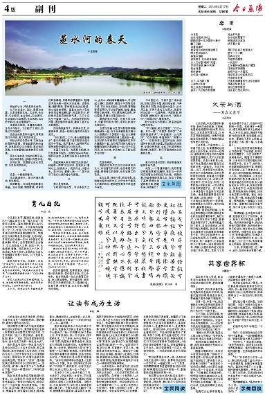 蒸水河的春天 龙国华 一 我始终认为,河流是有生命的。 它不仅仅是水、泥沙、青草与岸堤。它是活着的生命。它会笑,也会哭;它会呼吸,也会吞吐;它会清纯,也会浑浊;它会激昂,也会沉寂;它会步步鲜活,也会渐渐消亡…… 当清流与浊流,当潮涨与潮落,当汛水与枯水,它们给予了我们,而我们又如何呢? 这些生命的思索与追问,常常使我对于河流,有了另类的亲近。 而故乡的这条蒸水河,它所包含的思辨与哲理,所串起的风物与自然,所承载的文化与情感,更让我的灵魂,与它有着难以言表的牵系与联通。 蒸水千年奔流,它始终沉默不说。 我们日夜奔忙,却难以沉思不语。 此时此刻,我愿意让自己的思索,与这条河流有关。 二 这是一个普通的春日。 站立西渡桥头,蒸水河春水涌动,豪迈轰鸣。 我的眼前,已经是灵韵的春天诗篇。远山如黛,烟雾朦胧,河岸两边的香樟树,尽情的舒展着枝叶,随着沿河风光带一路向天边延伸;近景似画,遍野葱茏,草坪绵延出丝丝缕缕、赏心悦目的绿意,星星点点的小花也争先恐后萌出嫩红的、粉蓝的芽尖,呼吸里尽是清爽甘甜的气息。几只小鸟在空中盘旋一会儿,忽而欢快的掠过河面,漾起碧绿的涟漪,撞碎了蓝天白云的倒影。 而仿佛就是昨天,同样在这里,扑面而来的,却是一些难以描述的污垢与泥泞。 “长忆孤洲二三月,春山偏爱富春多”,春天的诗歌,绝不是在那些污垢与泥泞中写就。我不是诗人,却同样可以感受到那些情感与文化的共鸣。 当蓝天与白云,当青草与杨柳,当这些美丽与怡然,当那些远山与民舍,堆积沉淀的,正是我们经年不去的乡愁啊。 想起同样从蒸水河畔走出的游子,琼瑶那一声声“白云深处,是我故乡;眉间心上,皆我故乡。我欲归去,山高水长。我不归去,最断人肠……”,莫不说尽了我们心里的惦念与感悟。 三 蒸水是有幸的。 它短短的百余里,可以串起大云山、金华山、岣嵝峰等巍峨青山,可以聚起三湖町、西渡坪、衡西小平原等良田万顷,可以衍生王船山、彭玉麟、夏明翰等贤哲英烈,可以给予曾熙、琼瑶、唐浩明等文脉诗情,可以源流钟武古邑、伊山雪梅、界牌火灯等深远文化…… 最宽的蒸水河段,也宽不过三百米;但最窄的蒸水河段,也可以找到文化的标识。 当理性的船山思想与激情的明翰精神融在一起,当千年未解的禹王碑与人人皆晓的六个梦碰在一起,当火辣辣的花鼓戏与香喷喷的湖之酒放在一起,当灵动的九市稻草龙与静雅的石市竹木雕遇到一起,当竹海万顷的九峰山与鹭舞鸥翔的万源湖映在一起,对于这条河流,这片土地,你还有什么不能去感恩与热爱? 四 我是有幸的。 我就在这条生态与文化的河流边长大,沐浴着它的光泽,也传承着它的深蕴;感受着它的美丽,也见证着它的变迁。 生态立县、项目兴县、依法治县,这些看似报告中的文字,对于生长于斯成长于斯的我们,更能感受到其中的远虑与深思。 工业园区内,不再只是厂房和道路,还有公园与书屋;城郊结合部,不再是垃圾与灰霾,而是碧水和蓝天;企业用工里,不再只是代工与苦力,而是科技与信息……公路两旁,河堤街道,柳条成荫,樟树成行;城乡内外,“美丽乡村”,“百园计划”,蓄势竞发。 而文化软实力的振兴,更是劲盛的诗意与生机。 “学习雷锋,做小志愿者”、“日行一善,月习一德”、“中国梦·我的梦”、“寻根问祖话家训”、“书香衡州•文化蒸阳”、“欢乐潇湘·幸福蒸阳”、“相聚16点”……这些如夜之星空的活动,我知道其中的欢娱与崇高。而全国文化先进县、全国文明县城、全省卫生城市等问鼎冲剌,则是另一种不可阻挡的向上向善的力量。 五 蒸水河仍是沉默的,但却有着焕发般的生命气息。 此时此刻,一个普通的春日,我欣赏着这绿树成荫,鲜花遍野,我在与一条河流交流着生命的指征与内涵,我期待着,热血豪情的蒸阳儿女,在这个承载了美好梦想与希望的春天里,携起手来,并肩前行! 让读书成为生活 张坤 人的生活方式有多种多样,但我认为读书生活是一种最惬意的,最舒服的,最有价值的生活方式。 现任国家主席习近平就享受着这种生活方式的快乐。俄罗斯电视台主持人布里廖夫专访国家主席习近平时,习近平谈到,“我个人爱好阅读、看电影、旅游、散步”,“现在,我经常能做到的是读书,读书已成了我的一种生活方式”。 读书是总书记的一种生活方式不是他当上领导人之后才成为的,其实追溯起来,读书早就成了总书记的一种生活方式了。习近平爱读书至少可追溯到1969年。那年他16岁,在黄土高坡上开始知青生涯。“爱看书”、“好学”,是他留给陕北梁家河村老乡们的印象之一。他们记得,他“带一箱子书下乡”,在煤油灯下看“砖头一样厚的书”,“有时吃饭也拿着书”。 现在他常用自身经历激励新时代青年。2013年青年节,他同各界优秀青年代表座谈,“我到农村插队后,给自己定了一个座右铭,先从修身开始。一物不知,深以为耻,便求知若渴。上山放羊,我揣着书,把羊圈在山坡上,就开始看书。锄地到田头,开始休息一会儿时,我就拿出新华字典记一个字的多种含义,一点一滴积累。” 很多有成就的伟人生活中都少不了读书,我国伟大的民主革命先行者孙中山曾说过:“我一生的嗜好,除了革命之外,只有好读书,我一天不读书,便不能够生活。”几十年来,孙中山养成了一个好习惯,就是每天都要读些书,甚至在火线指挥作战的时候,