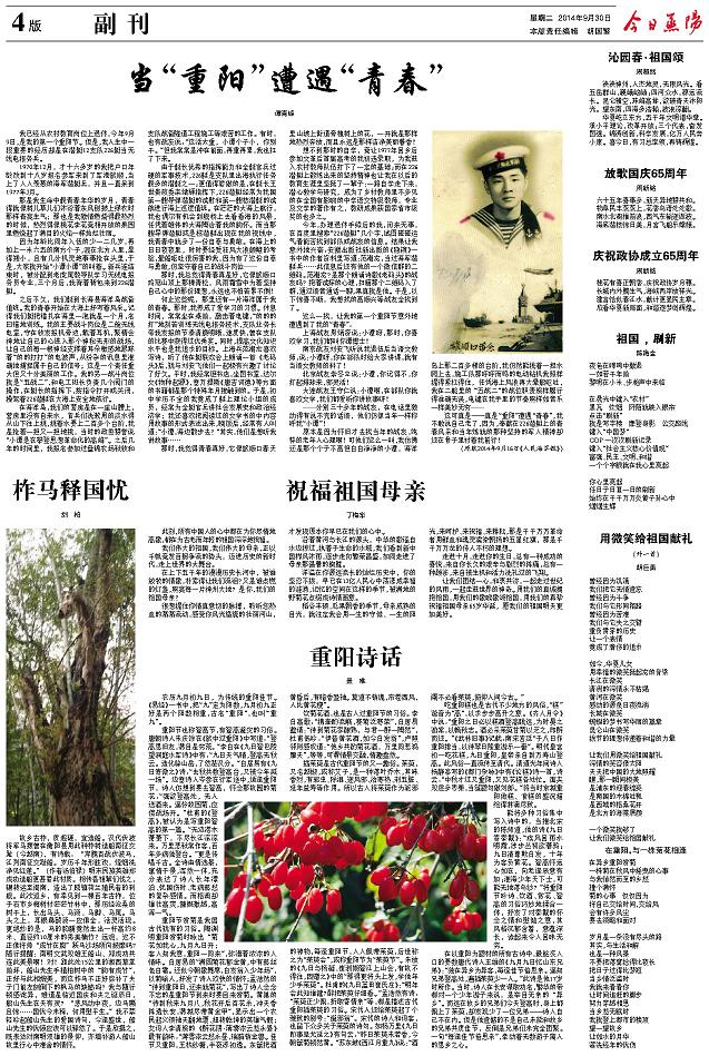 农历九月初九日,为传统的重阳佳节。《易经》一书中,把“九”定为阳数,九月初九正好是两个阳数相重,古名“重阳”,也叫“重九”。 重阳节也称登高节,有登高避灾的习俗。唐朝诗人朱庆馀在《旅中过重阳》中写道:“登高思旧友,满目是穷荒。”李白在《九日登巴陵望洞庭水军诗》中有:“九日天气晴,登高无秋云。造化辟山岳,了然楚汉分。”白居易有《九日寄微之》诗:“去秋共数登高台,又被今年减一场”。边塞诗人岑参在行军途中,适逢重阳节,诗人仍想到要去登高,怀念那故园的菊花:“强欲登高处,无人送酒来。遥怜故园菊,应傍战场开。”杜甫的《登高》,被认为是写重阳登高的第一篇。“无边落木萧萧下,不尽长江滚滚来。万里悲秋常作客,百年多病独登台。”更是传唱千古。全诗由情选景,寓情于景,浑然一体,充分表达了诗人长年漂泊、忧国伤时、老病孤愁的复杂感情。而格调却雄壮高爽,慷慨激越,高浑一气。 重阳节赏菊是我国古代就有的习俗。陶渊明重阳赏菊时咏出“菊花如我心,九月九日开;客人知我意,重阳一同来”,弥漫着浓浓的人情味。白居易的“满园菊花郁金黄,中有孤丝色白霜。还似今朝歌舞席,白发翁入少年场”,以菊喻人,抒发了诗人欢快的情怀;孟浩然的“待到重阳日,还来就菊花”,写出了诗人念念不忘的是重阳节到来时要回来赏菊。黄巢的“待到秋来九月八,秋花开后百花杀,冲天香阵透长安,满城尽带黄金甲”,显示出一个农民起义领袖天翻地覆、扭转乾坤的英雄气概;女词人李清照的《醉花阴·薄雾浓云愁永昼》最有韵味:“薄雾浓云愁永昼,瑞脑销金兽。佳节又重阳,玉枕纱橱,半夜凉初透。东篱把酒黄昏后,有暗香盈袖。莫道不销魂,帘卷西风,人比黄花瘦”。 饮菊花酒,也是古人过重阳节的习俗。李白高歌:“携壶酌流觞,赛菊泛寒荣”,白居易邀请:“待到菊花家酿熟,与君一醉一陶然”,杜甫低吟:“伊昔黄花酒,如今白发翁”,卢照邻则感叹道:“他乡共酌菊花酒,万里同悲鸿雁天”,等等,可谓情景交融,情趣盎然。 插茱萸是古代重阳节的又一趣俗。茱萸,又名越椒,或称艾子,是一种落叶乔木,其味香烈,有驱虫、除湿、逐风邪、治寒热、利五脏、延年益寿等作用。所以古人将茱萸作为驱邪的神物,每逢重阳节,人人佩带茱萸,后世称之为“茱萸会”,或称重阳节为“茱萸节”。朱放的《九日与杨凝、崔淑期登江上山会,有故不得往,因赠之》中的“那得更将头上发,学他年少手茱萸”。杜甫的《九日蓝田崔氏庄》:“明年会此知谁健?醉把茱萸仔细看。”孟浩然有诗:“茱萸正少佩,折取寄情亲”等,都是描述古代重阳插茱萸的习俗。宋代人还给茱萸起了个雅致的别号:“避邪翁”。宋代的诗人和词客,也留下众多关于茱萸的诗句。如杨万里《九日即事呈尤延之》有句云:“昨日茱萸未若香,今朝篱菊顿然黄。”苏东坡《西江月重九》说:“酒阑不必看茱萸,俯仰人间今古。” 吃重阳糕也是古代不少地方的风俗,“糕”谐音为“高”,以求步步高升之意。《齐人月令》中说:“重阳之日必以糕酒登高眺远,为时晏之游常,以畅秋志。酒必采茱萸甘菊以乏之,即醉而还。”《武林旧事》记载:南宋宫廷“于八日作重阳排当,以待翠日隆重游乐一番”。明代皇宫初一吃花糕,九日重阳,皇帝亲自到万寿山登高。此风俗一直流传至清代。清道光年间诗人杨静亭写的《都门杂咏》中有《论糕》诗一首,诗云:“中秋才过又重阳,又见花糕各处忙。面夹双层多枣栗,当筵题句傲刘郎。”将当时京城重阳做糕、食糕的盛况描绘得淋漓尽致。 能将多种习俗集中写入诗中的,当推北宋的陈师道,他的诗《九日寄秦觏》:“疾风回雨水明霞,涉步丛祠欲暮鸦;九日清尊欺白发,十年为客负黄花。登高怀远心如在,向老逢辰意有加;淮海少年天下士,可能无地落乌纱?”将重阳节吟诗、饮酒、赏花、登高的习俗巧妙地揉合一体,抒发了对秦觏的怀念之情和慰勉之意,其风格沉郁含蓄,意蕴深长,读起来令人回味无穷。 在以重阳为题材的所有古诗中,最脍炙人口的要数唐代诗人王维的《九月九日忆山东兄弟》:“独在异乡为异客,每逢佳节倍思亲。遥知兄弟登高处,遍插茱萸少一人。”此诗是他17岁时所作。当时,诗人在长安谋取功名,繁华的帝都对一个少年游子来说,是举目无亲的“异乡”。而远在故乡的兄弟们今天登高时,身上都佩上了茱萸,却发现少了一位兄弟——诗人自己不在内。但是他遗憾的不是自己未能和故乡的兄弟共度佳节,反倒是兄弟们未完全团聚。一句“每逢佳节倍思亲”,牵动着无数游子离人的思乡之心。 沁园春·祖国颂 周超然 泱泱神州,人杰地灵,无限风光。看五岳群山,巍峨峻峭;四河众水,源远流长。昆仑横空,珠峰高耸,欲破青天沐阳光。望东南,四海多浩瀚,波浪滚翻。 华夏屹立东方,五千年文明谱华章。承小平理论,改革开放;三个代表,奋发图强。锦涛创新,科学发展,亿万人民奔小康。喜今日,有习总率领,再铸辉煌。